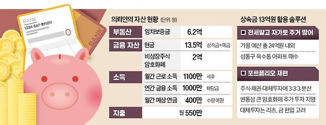 Q. 서울 반포동에 살며 강남권에서 근무하는 50대 맞벌이 부부다. 현재 자가를 보유하지 않고 반전세로 거주하고 있다. 월 소득은 1100만 원 수준이다. 최근 상속으로 13억원 현금이 생겼는데, 이를 성동·송파구 내 구축 아파트 매수에 쓸지, 반포 내 신축 아파트 전세로 살면서 주식·암호화폐에 투자할지를 두고 남편과 의견이 엇갈린다.