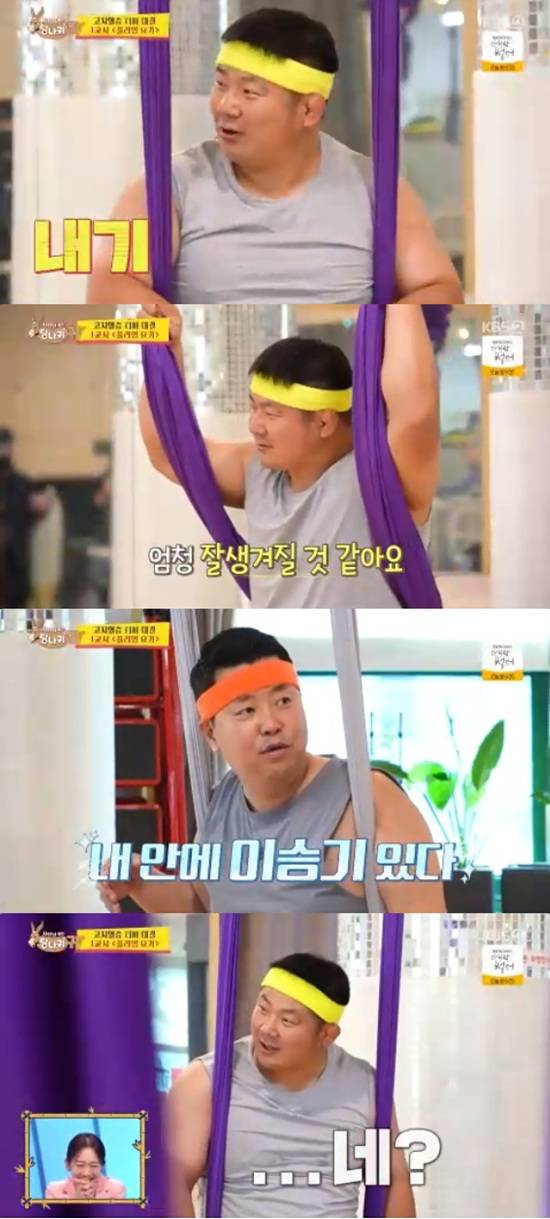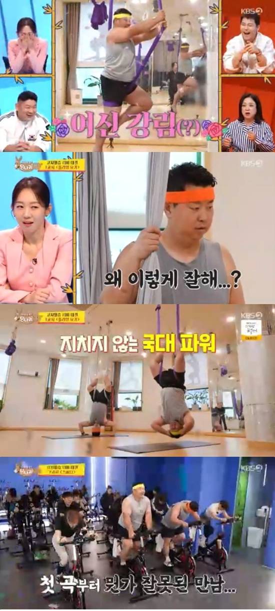 (엑스포츠뉴스 원민순 기자) 황희태 감독이 플라잉 요가 첫 도전에 인어자세에 성공했다.