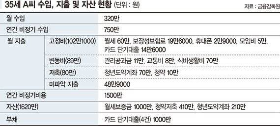 35세 A씨 월 수입은 320만원이다. 연간 비정기 수입은 750만원이 들어온다. 월 지출은 271만1000원이다. 고정비가 월세(60만원), 보장성보험료(19만6000원), 휴대폰(2만9000원), 모임비(5만원), 카드 단기대출(14만6000원) 등 102만1000원이다. 변동비는 관리공과금(11만원), 교통비(8만원), 식비·생활비(70만원) 등 89만원이다. 저축은 청년도약계좌(70만원), 청약저축(10만원) 등 총 80만원씩 하고 있다. 미파악 지출은 48만9000원이다. 연간 비정기 비용은 1500만원이다. 자산은 월세보증금(1000만원), 청약저축(410만원), 청년도약계좌(210만원) 등 1620만원이 있다. 부채는 카드 단기대출 4건을 받아 총 1000만원이 있다.