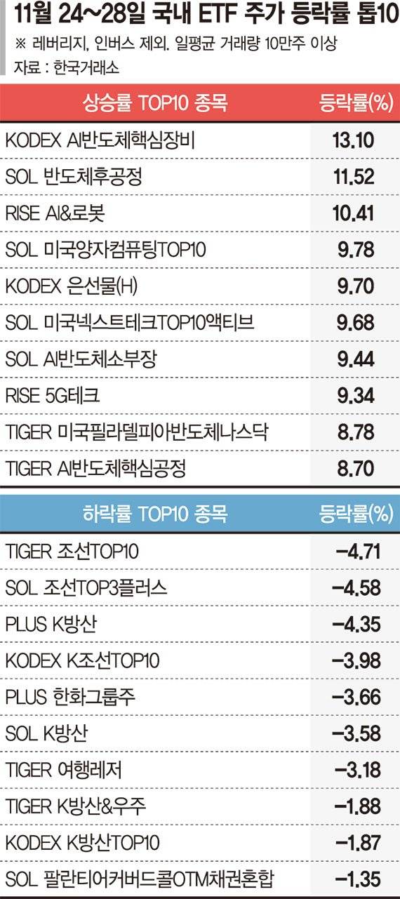 이외 'KODEX AI반도체핵심장비'(13.10%), 'SOL 반도체후공정'(11.52%), 'RISE AI&로봇'(10.41%), 'SOL AI반도체소부장'(9.44%), 'TIGER 미국필라델피아반도체나스닥'(8.78%), 'TIGER AI반도체핵심공정'(8.70%) 등 AI 반도체 관련주가 상위권에 이름을 올렸다.