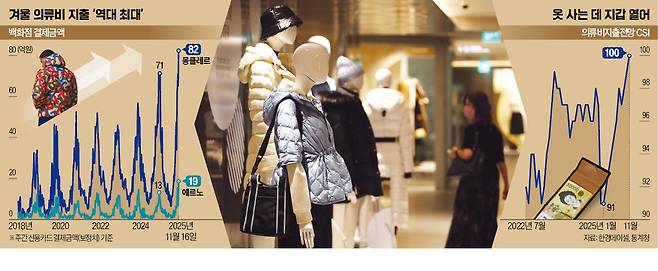 전체 의류 소매판매 실적도 증가세로 돌아섰다. 상반기에는 작년 동기 대비 1.6% 감소했으나 7~9월엔 3.6% 증가했다. 박이경 한경에이셀 데이터 애널리스트는 “본격적인 한파가 오기 전부터 고가 패딩 판매가 눈에 띄게 늘고 있다”며 “소비심리 회복 추세가 이어질 경우 장기간 침체를 겪어온 국내 패션기업 전반에 훈풍이 예상된다”고 말했다.
