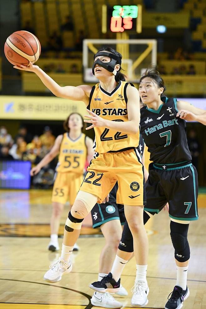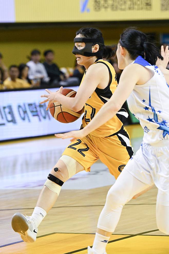 청주 KB스타즈 가드 성수연은 코뼈 보호 마스크를 착용한 채 경기에 나섰다.