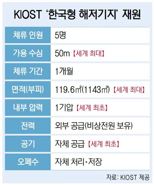 최종 모델은 가로 12.5m 세로 15.6m 높이 6.2m ‘메인 모듈’을 중심으로, 각각 지름 5.0m 길이 10.0m짜리 원통형 ‘데이센터 모듈’과 ‘거주 모듈’을 좌우로 연결한 형태다. 면적 119.6㎡, 부피는 1143㎥로 현존하는 해저 기지 중 세계 최대 규모다. 해양플랜트나 항만시설에 쓰이는 강철로 제작해 기술 목표상 해저 50m(6기압)에서 5명까지 거주할 수 있는데, 이 또한 세계 최초다.