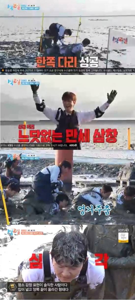 이날 딘딘은 '괴도 배고팡' 힌트가 걸린 갯벌 임파서블 미션을 위해 놋다리가 된 멤버들을 밟고 깃발을 향해 움직였다.