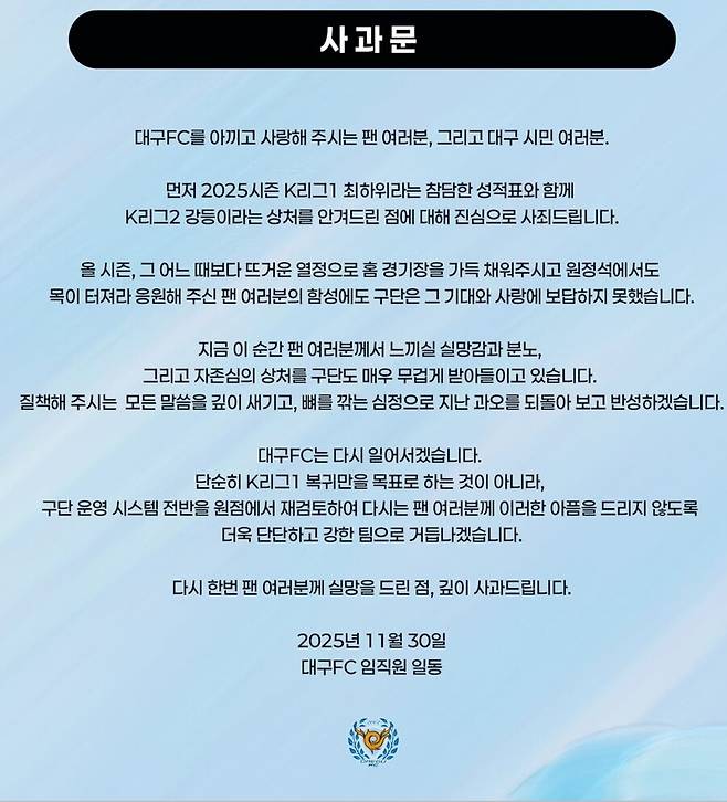 대구는 "2025시즌 K리그1 최하위라는 참담한 성적표와 함께 K리그2 강등이라는 상처를 안겨드린 점에 대해 진심으로 사죄드린다"고 밝혔다.