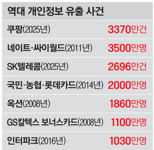 2008년 옥션(1860만명), GS칼텍스(1100만명), 2016년 인터파크(1030만명) 정보 유출도 ‘대형 사고’로 꼽힌다. 지난 4월 발생한 SK텔레콤 유심 정보 2696만건 유출 역시 통신 업계에서 최대 규모였다.