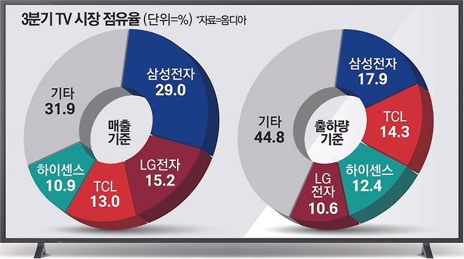 30일 시장조사 업체 옴디아에 따르면 삼성전자는 올 3분기 TV 시장에서 매출과 출하량 기준 모두 점유율 1위를 유지했다.