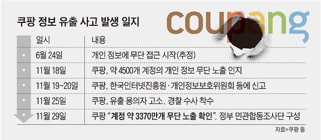 하지만 쿠팡이 스스로 정보 유출 사실을 감지한 것도 아니었다. 쿠팡이 정보 유출을 인지했다고 주장하는 시점(11월 18일)보다 이틀 앞선 지난달 16일 한 쿠팡 사용자가 쿠팡에 민원을 제기했다. 이 사용자는 “알 수 없는 사람으로부터 내 이름과 주소, 최근 쿠팡에서 산 품목 5개를 알고 있다는 내용의 이메일을 받았다”며 쿠팡 측에 확인을 요청한 것이다. 쿠팡은 황급히 검증에 나섰고, 그제야 정보 유출이 일어난 사실을 파악했다. 만약 이 고객의 민원이 없었다면, 3370만명의 정보가 새 나간 상황이 언제까지 방치됐을지 알 수 없는 셈이다.