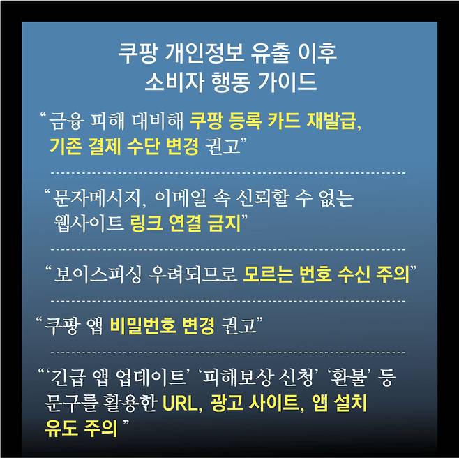 국내 이커머스 점유율 1위 업체 쿠팡에서 약 3370만 건의 고객 개인정보가 유출되면서 소비자들의 불안이 커지고 있다. 2차 피해를 우려해 등록된 결제수단을 삭제하거나 매월 자동 결제되는 ‘와우 멤버십’을 해지하는 움직임도 나타나고 있다. ‘늑장 통보’와 보상 공백 등 쿠팡의 대응을 둘러싼 불만도 이어지고 있다.