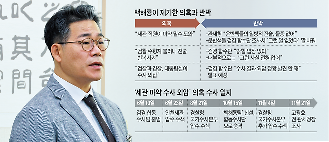 백 경정은 서울 영등포경찰서 형사과장이었던 2023년 마약 밀수 사건을 수사하다가 말레이시아인 운반책 3명에게서 인천공항 세관 공무원들이 마약 밀수 과정에서 도움을 줬다는 진술을 확보했다. 이후 그는 세관 공무원 등으로 수사를 확대하다가 윤석열 정부의 대통령실·검찰·경찰의 외압을 받았고 서울 강서경찰서 지구대장으로 좌천당했다고 주장해 왔다. 최근엔 윤 전 대통령 부부가 내란 자금을 마련하려고 ‘마약 수입 사업’을 했다는 주장도 하고 있다.
