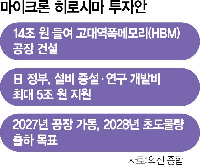 니혼게이자이신문에 따르면 미국 반도체 기업 마이크론은 인공지능(AI)용 반도체 생산을 위해 일본 히로시마의 기존 공장에 신규 생산 라인을 증설합니다. 투자비는 약 1조 5000억 엔(약 14조 원)으로 일본 정부가 투자액의 3분의 1에 달하는 최대 5000억 엔(약 4조 7000억 원)을 지원하기로 했습니다. 새 공장에서는 데이터 전송 속도가 뛰어나 생성형 AI 처리에 적합한 차세대 고대역폭메모리(HBM)를 생산할 예정입니다. 출하 예정 시기는 2028년입니다. 닛케이는 “히로시마 신규 공장은 세계 굴지의 차세대 HBM 거점이 될 것”이라며 “기술에서 앞서가는 SK하이닉스를 추격할 것”이라고 했습니다.