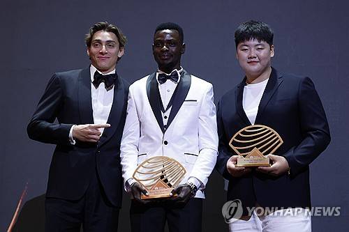 epaselect epa12560695 (L-R) Swedish pole vaulter Armand Duplantis (L) receives Male Field Athlete of the Year, Kenyan long distance runner Edmund Serem (C) receives Male Rising Star, and Chinese hammer thrower Zhang Jiale (R) receives the Female Rising Star of the Year award during the World Athletics Awards at the Monaco Yacht Club in Monaco, 30 November 2025. EPA/SEBASTIEN NOGIER