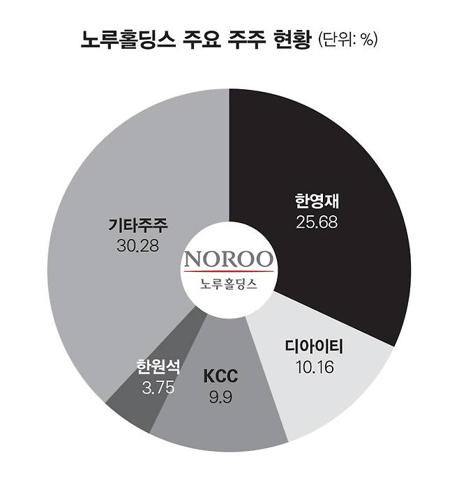KCC는 최근 노루홀딩스 지분을 대거 쓸어담았다. 현재 KCC의 지분율은 9.90%에 이른다. 잠깐이지만 한영재 노루그룹 회장(25.22%)에 이은 2대 주주에 오르기도 했다. 이 지분 매입을 위해 KCC가 투입한 돈만 300억원 이상인 것으로 알려졌다. 2022년 KCC가 기록한 당기순이익(287억원)보다 많다. 주목되는 사실은 노루홀딩스가 도료 업계 2위인 노루페인트의 모회사라는 점이다. 업계 1위인 KCC와는 경쟁사 관계다. 그런 회사의 지분을 KCC가 집중적으로 사들이면서 재계의 이목이 집중되고 있다.