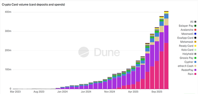 가장 많이 사용된 브랜드는 비자와 호환되는 스테이블코인 지원 카드 발생 업체인 레인(Rain)이다. 레인은 비자 카드를 지원하는 모든 가맹점들에서 스테이블코인으로 결제를 할 수 있는 카드를 발급한다.레인은 2억4029만달러의 사용량을 기록했다.