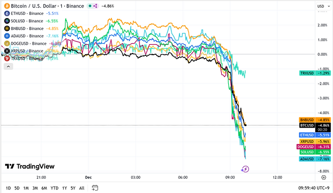 비트코인은 이날 오전 8시부터 급락을 시작해 2시간만에 4.42% 하락했다.