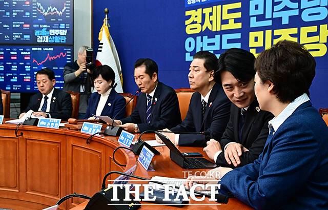 [더팩트ㅣ국회=배정한 기자] 정청래 더불어민주당 대표(가운데)가 1일 오전 서울 여의도 국회에서 열린 최고위원회의에 참석해 모두발언을 하고 있다.