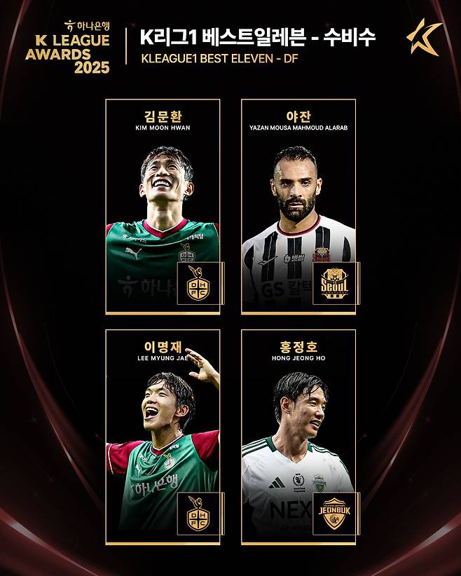 양 측면 수비수 자리에는 대전 듀오가 뽑혔다. 이명재는 시즌 도중에 합류했음에도 이번 시즌 리그에서 가장 뛰어난 레프트백으로 호명됐다. 지난 시즌 울산 소속으로 받은 데 이어서 2시즌 연속 선정됐다. 김문환 역시 꾸준한 경기력을 내세워 최고의 라이트백으로 지목됐다. 김문환은 이번 시즌 24경기에서 2도움을 올렸다.