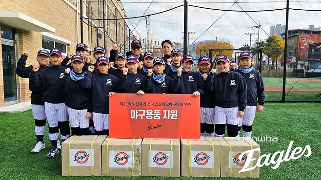 한화이글스가 연고지역 초등학교 야구팀에 야구용품을 지원했다.