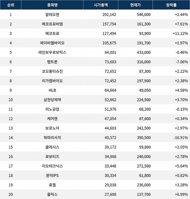 시가총액 3위인 에코프로(086520)는 93,900원으로 전 거래일 대비 11.12% 급등했다. 에이비엘바이오(298380)는 1.97% 상승한 191,700원을, 레인보우로보틱스(277810)는 0.46% 하락한 433,000원을 기록 중이다. 펩트론(087010)은 316,000원으로 7.06% 하락하고 있으며, 코오롱티슈진(950160)은 87,300원으로 2.22% 상승하였다. 리가켐바이오(141080)는 197,900원으로 2.38% 상승, HLB(028300)는 49,050원으로 4.58% 상승 중이다. 삼천당제약(000250)은 224,500원으로 3.70% 상승세를 보이고 있다.