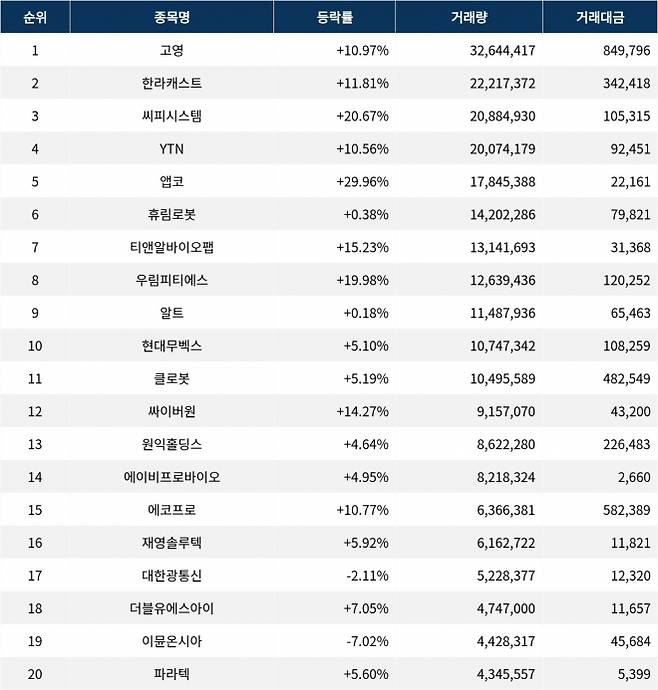 한편 거래량 상위 20위권 종목들은 클로봇(466100) ▲5.19%, 싸이버원(356890) ▲14.27%, 원익홀딩스(030530) ▲4.64%, 에이비프로바이오(195990) ▲4.95%, 에코프로(086520) ▲10.77%, 재영솔루텍(049630) ▲5.92%, 대한광통신(010170) ▼2.11%, 더블유에스아이(299170) ▲7.05%, 이뮨온시아(424870) ▼7.02%, 파라텍(033540) ▲5.60% 등의 성적을 기록했다.