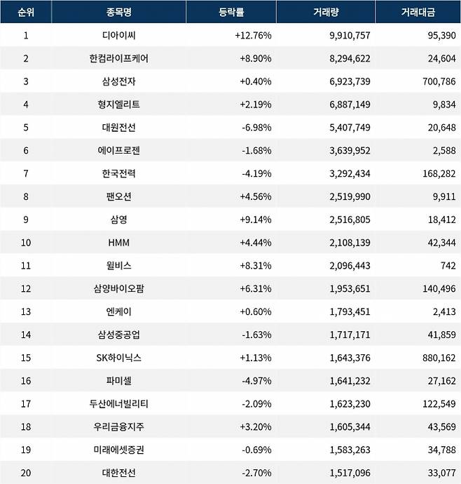 삼성전자(005930)는 6,923,739주의 거래량으로 3위를 기록하고 있으며, 현재가는 100,900원, 등락률은 0.40%에 머물고 있다. 형지엘리트(093240)는 6,887,149주의 거래량과 2.19% 상승한 주가 1,354원을 기록하고 있다. 대원전선(006340)은 5,407,749주의 거래량과 함께 6.98%의 하락세를 나타내며 주가는 3,730원이다. 에이프로젠(007460), 한국전력(015760), 팬오션(028670), 삼영(003720), HMM(011200) 등은 각각 1.68% 하락, 4.19% 하락, 4.56% 상승, 9.14% 상승, 4.44% 상승을 기록하고 있다.