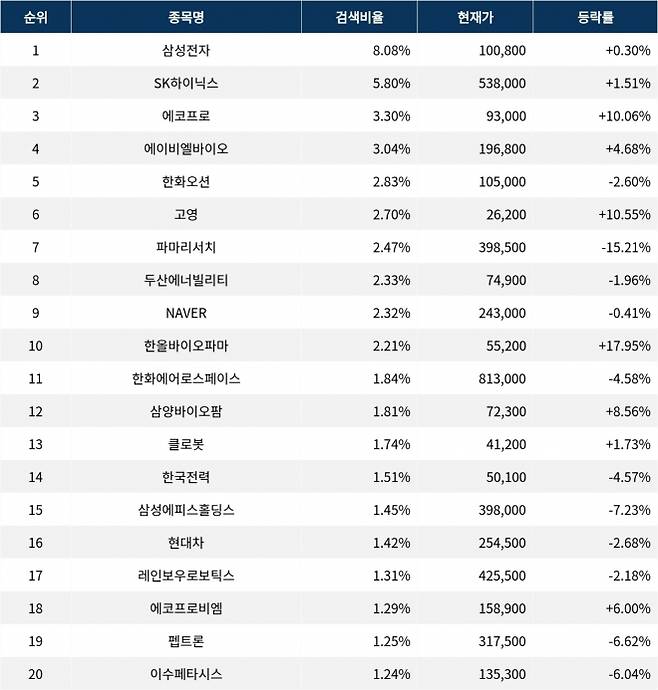 이어 검색비율 2위의 SK하이닉스(000660)는 상승률 1.51%로 상승 마감했다. 검색비율 3위의 에코프로(086520)는 10.06% 상승 마감했다. 검색비율 4위 에이비엘바이오(298380)는 4.68% 상승했다. 검색비율 5위 한화오션(042660)은 -2.60% 하락했다.