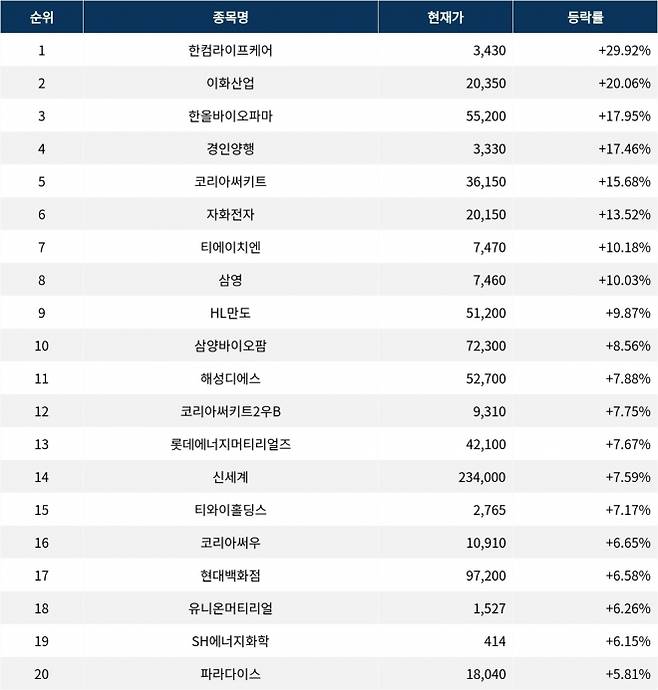 이어 상승률 2위 이화산업(000760)은 주가가 20.06% 폭등하며 종가 20,350원에 상승 마감했다. 상승률 3위 한올바이오파마(009420)의 주가는 55,200원으로 17.95% 급등했다. 상승률 4위 경인양행(012610)은 17.46% 상승하며 3,330원에 마감했다. 상승률 5위 코리아써키트(007810)는 15.68%의 상승세를 타고 종가 36,150원에 마감했다.