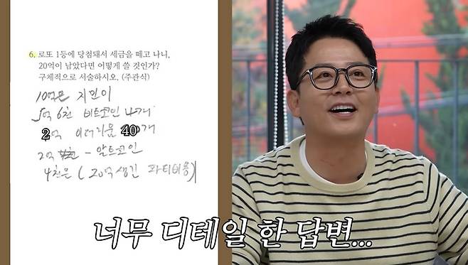 이어 '로또 1등에 당첨돼서 세금을 떼고 나니 20억이 남았다면 어떻게 쓸 것인가'라는 질문에 김지민은 "부동산 쪽으로 투자할 것. 아니면 돈을 좀 더 모아서 집을 살 것"이라며 미래지향적인 답변을 내놨다. 하지만 김준호는 "10억은 지민이, 5억 6천만 원은 비트코인 4개, 2억은 이더리움 40개, 나머지 2억은 알트코인, 4천은 20억이 생긴 기념으로 파티를 할 것"이라고 자세한 계획을 늘어놨다. 이에 김지민은 "안 쓰면 모이는 돈인데 왜 쓰냐"며 답답함을 드러냈다. "죽을 때 가져갈 거냐"는 김준호의 반박에 김지민은 "상관 없다. 어차피 당첨 안 된다"고 말해 웃음을 자아냈다.