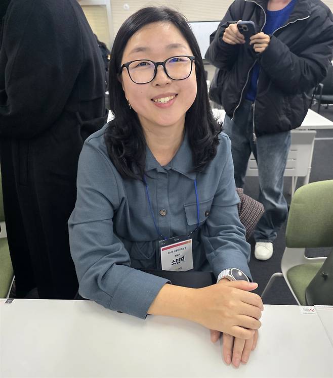 | ▲ 농난청인의 삶에 대한 인스타툰 '코다맘 위소'을 그리는 소민지 작가. 2025년 11월 AUD사회적협동조합의 행사 '소통이 흐르는 밤'에서 자신의 이야기를 나눴다. |