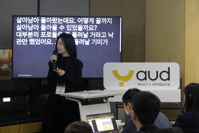 | ▲ KBS 최초의 농난청인 아나운서인 노희지 앵커가 2025년 11월 AUD사회적협동조합이 개최한 '소통이 흐르는 밤'행사에서 강연하고 있다. |