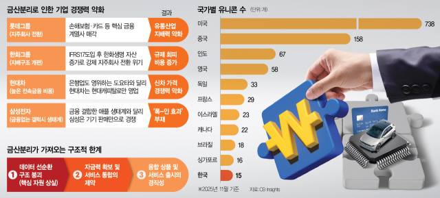 기업가치가 1조 원이 넘는 유니콘 기업이 한국에 적은 이유도 금산분리 규제와 관련이 있다는 지적도 있다. 실제로 CB인사이츠에 따르면 올해 11월 기준 미국의 유니콘 기업은 738곳에 달하지만 한국은 15곳에 불과하다. 재계 관계자는 “금산분리로 국내 기업들은 금융·핀테크 투자가 어렵고 금융사들은 일반 기업 투자를 대규모로 할 수 없다”고 말했다.