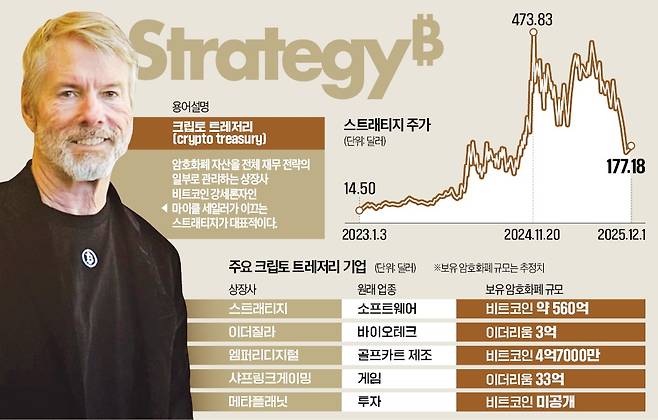 세계 최대 비트코인 보유사 스트래티지 등 암호화폐를 사들여 기업 가치를 끌어올리는 전략을 써온 ‘크립토 트레저리’(crypto treasury·암호화폐 금고) 기업들이 휘청이고 있다. 비트코인이 폭락하면서 줄줄이 위기에 빠졌다. 암호화폐를 담보로 대출받아 자사주를 매입하는가 하면 아예 코인을 매도하는 기업도 증가하고 있다. 이런 기업들의 암호화폐 매도가 늘며 코인 가격 하락 압력이 커질 수 있다는 전망이 나온다.