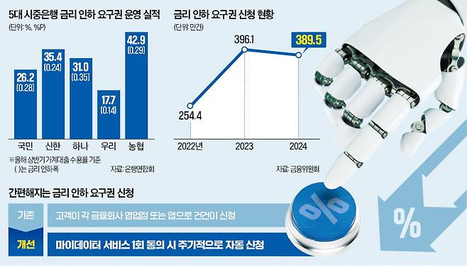 지금까지는 금융소비자가 금리 인하 요구권을 행사하려면 각 금융사 영업점을 방문하거나 앱을 통해 일일이 신청해야 했다. 문제는 금리 인하 요구권의 존재와 신청 방법 등을 모르는 차주가 여전히 많다는 점이다. 은행이 대출받은 고객에게 연 2회 금리 인하 요구권을 안내하지만 상당수 차주는 금융사 문자를 스팸 메시지로 생각하기 일쑤다. 이인영 더불어민주당 의원에 따르면 올해 5대 시중은행의 금리 인하 요구권 대상자 중 신청자 비율은 5.13%에 불과했다.