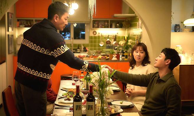 더 큰 문제는 제한된 공간과 단출한 플롯을 뒷받침할 말의 재미가 턱없이 부족하다는 점이다. 밀도 높은 대사 ‘티키타카’가 장점이었던 소동극 ‘롤러코스터’, ‘로비’ 등과 비교하면 지루한 연극처럼 보이는 장면이 적지 않다. “제 삶은 제 삶, 저 사람은 저 사람 삶을 살죠. 저녁이면 가급적 마주치지 않아요.”(정아) 같은 연극 톤 대사는 스크린보다는 무대에 더 어울릴 듯하다.