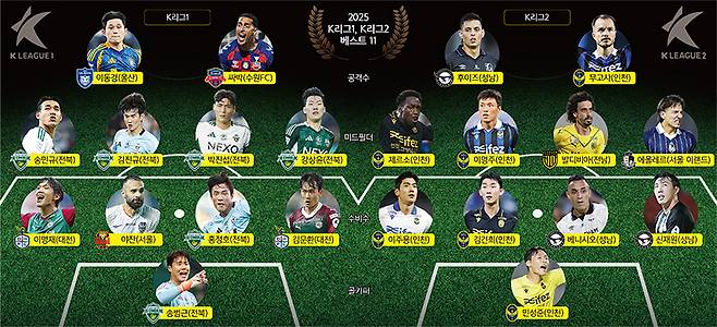 한국프로축구연맹은 올 시즌 K리그1, K리그2를 빛낸 베스트11와 득점왕, 도움왕을 1일 발표했다. 베스트11은 K리그1 12개팀 감독과 주장, 미디어 투표로 진행됐다.