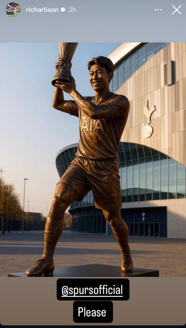 손흥민의 동상 건립을 구단에 요청한 것. 동상에는 손흥민이 유럽축구연맹(UEFA) 유로파리그(UEL) 우승 트로피를 들고 환하게 웃고 있는 모습이 담겼다. 히샬리송은 “함께해 영광이었다. 훌륭한 리더이자 프로였다”며 존경을 표현했다. 실제 이후 토트넘은 구단에 크게 기여한 선수들의 동상 건립 등을 추진한다고 공식적으로 밝힌 바 있다.