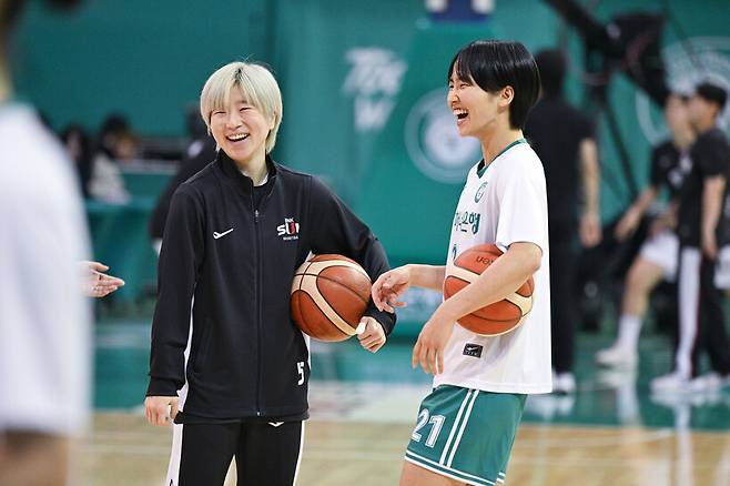 경기 전 사키와 BNK 선수단은 옛 정을 나누는 시간을 가졌다.
