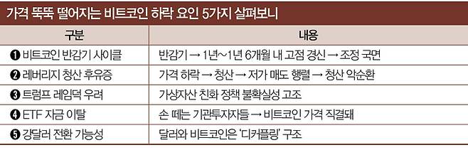 하락장의 기점을 레버리지(차입 기반 투자) 청산 사태로 보는 시선도 있다. 디지털자산 솔루션 기업 헥스트러스트의 알레시오 콰글리니 최고경영자(CEO)는 “10월 10일 비트코인 급락으로 일어난 190억달러(약 27조8000억원) 레버리지 청산 사태로 전환점이 왔다”며 “이번 조정 국면이 당분간 지속돼 7만달러대 초반까지 시험받거나 일시적으로 그 이하로 하락할 수 있다”고 말했다.