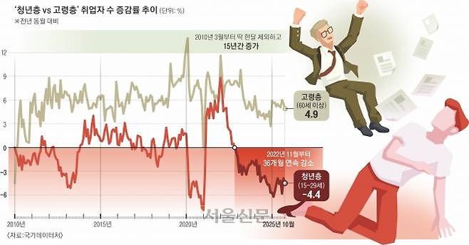 1일 국가데이터처에 따르면 지난 10월 취업자는 2904만명으로 전년 동월 대비 19만 3000명 늘었다. 전체 고용은 증가했지만, 청년층(15~29세)은 같은 기간 16만 3000명 감소해 2022년 11월 이후 36개월 연속 줄었다. 반면 60세 이상 고령층은 33만 4000명 증가하며 57개월 연속 상승했다. 2010년 3월부터 단 한 달(2021년 1월)을 제외하면 187개월 동안 증가세가 이어진 것이다.