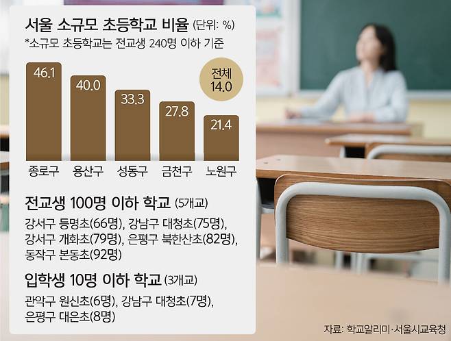 30일 초·중등 교육정보 공시서비스인 학교알리미 분석 결과 서울 지역 초등학교 608곳(휴교 제외) 중 올해 4월 기준 전교생 240명 이하 학교(85개교)는 14.0%로 1년 전(11.4%·69개교)보다 2.6%포인트 올랐다. 서울시교육청은 초등학교는 전교생 240명 이하, 중·고등학교는 300명 이하일 경우 소규모학교로 분류하고 있다.