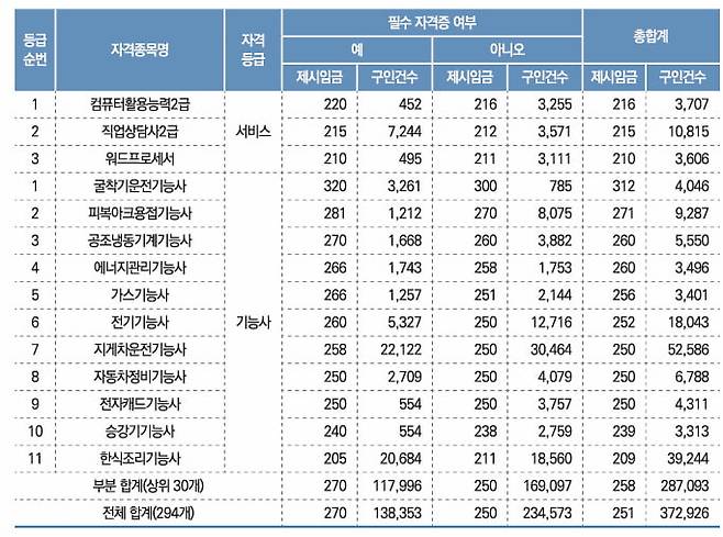 기능사 중에서는 굴삭기운전기능사가 320만원으로 가장 높았다. 한식기능사는 필수인 공고가 되레 필수가 아닌 공고보다 임금 제시 수준이 낮아 눈길을 끌었다 .연구진은 "시간선택제나 단시간 근로 비중이 높아 필수 요구시 오히려 임금이 낮게 나타났다"고 설명했다.