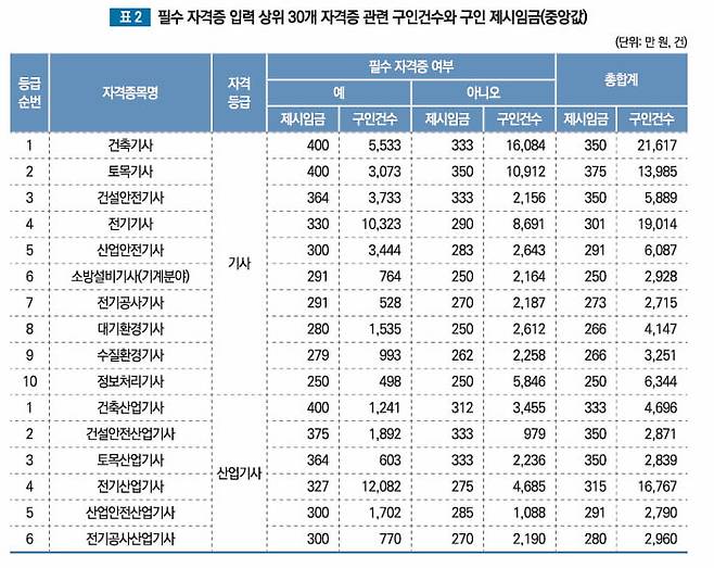 이 중 특정 자격을 '필수 자격'으로 요구한 구인건수는 13만8353건이었으며 상위 30개 자격 관련 구인 건수가 11만7996건에 달해 일부 자격증에 수요가 편중된 현상이 나타났다.