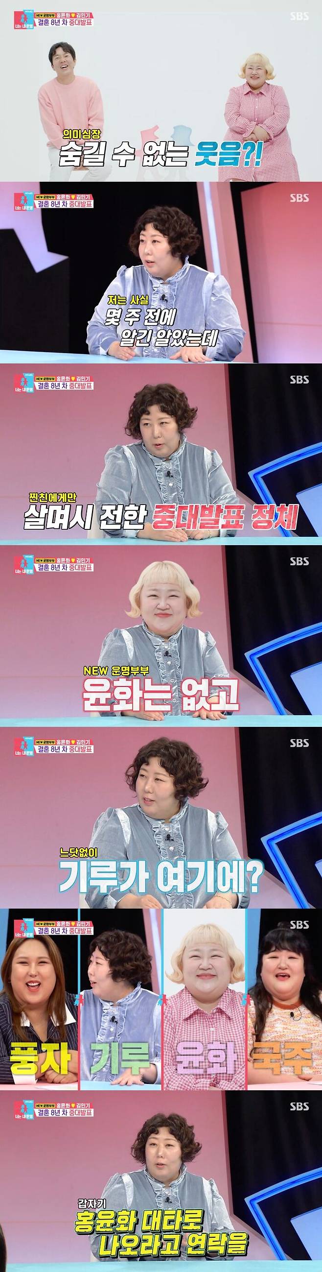이날 방송에서 홍윤화는 중대 발표를 하려고 나왔다고 밝혀 눈길을 끌었다. 이어 그는 "스튜디오에 있는 기루 언니는 알고 있다"라고 말했다.