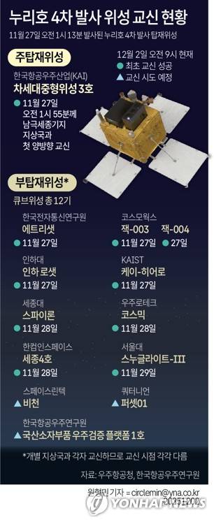 (서울=연합뉴스) 원형민 기자 = 우주항공청과 한국항공우주연구원은 2일까지 누리호 4차 발사를 통해 발사된 큐브위성 12기 중 9기와 교신에 성공했다고 밝혔다.