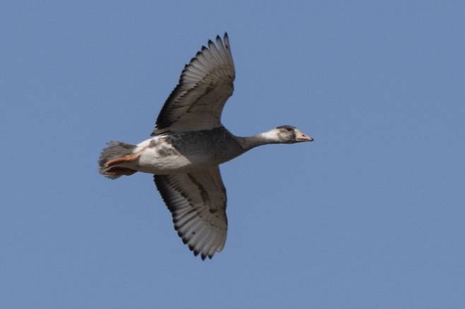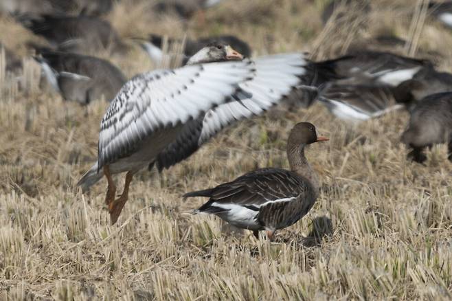 올해는 황기러기 이외에도 또 다른 백변종이 찾아왔다. 어린 개체다. 일반적인 쇠기러기는 몸 전체가 암갈색이며 배에 검은 가로줄 무늬가 나타나고, 이마에는 선명한 흰색을 띤다. 그러나 이번에 새롭게 관찰된 백변종 기러기는 가슴과 옆구리, 목 일부분이 회색이고 배 아랫면은 흰색이다. 몸 윗면의 흰색 깃털에는 불규칙한 회갈색 반점이 있어 ‘얼룩기러기’라는 이름이 어색하지 않다.
