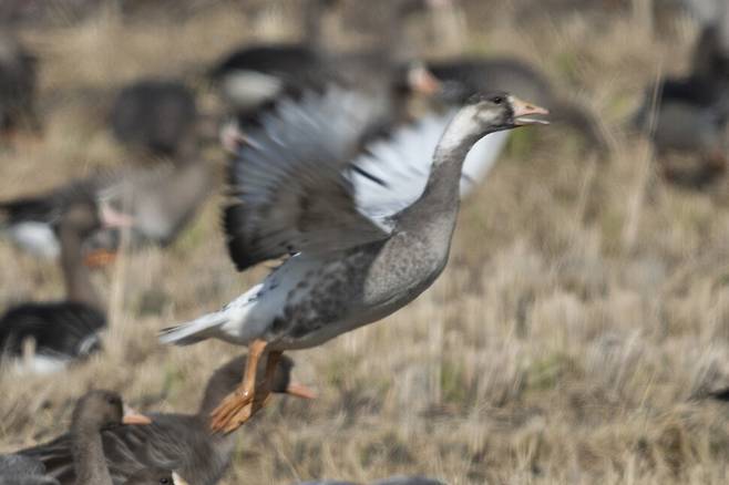 깃색이 다르면 무리에서 소외되기도 하지만, 황기러기와 얼룩기러기는 앞줄에서 당당하게 행동하며 다른 개체들과 잘 어울리고 있었다. 지난 30여년 탐조생활 중 황기러기와 얼룩기러기, 붉은가슴기러기까지 동시에 관찰한 것은 올해가 처음이다. 멋진 자태로 강화도를 찾아온 쇠기러기들이 대견하고 고맙다.