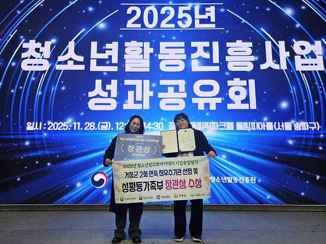 거창군 청소년방과후아카데미(거창흥사단 운영)는 지난 28일 서울올림픽파크텔에서 열린 ‘2025년 청소년방과후아카데미 사업 종합평가’에서 최우수기관으로 선정되며 성평등가족부 장관상을 수상했다.