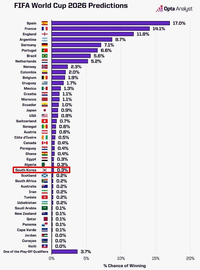 축구통계매체 '옵타'는 1일(한국시간) "2026 국제축구연맹(FIFA) 북중미(캐나다·미국·멕시코 공동개최) 월드컵 조 추첨을 앞두고, 슈퍼컴퓨터가 이번 월드컵에 대한 초기 예측을 내놓았다"라고 보도했다.