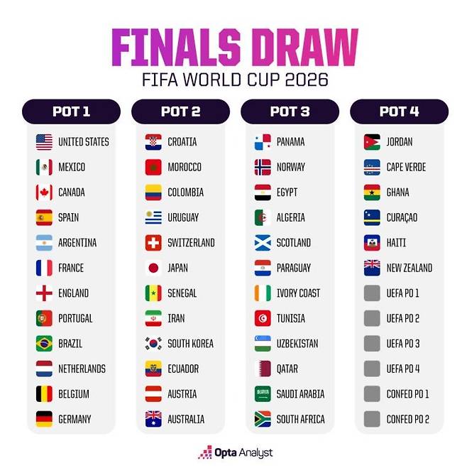 북중미 월드컵 조 추첨은 오는 12월6일 미국 워싱턴DC에서 열린다. 총 48개국이 참가함에 따라 조 추첨은 12개국씩 4개의 포트로 나뉘어 진행된다.