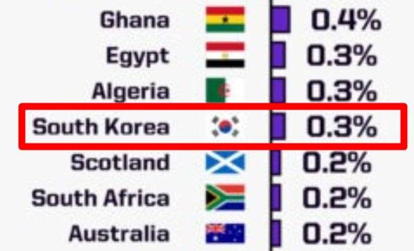매체에 따르면 슈퍼컴퓨터는 이집트, 알제리와 함께 한국의 북중미 월드컵 우승 가능성을 0.3%로 평가했다. 지난 11월 A매치 기간에 1-0으로 격파했던 가나(0.4%)보다 낮게 평가됐다.